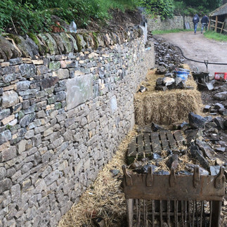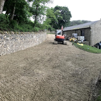 Next we moved onto fixing the barn wall, we excavated alongside the barn wall and removed the loose stone fill, we placed 25m3 of concrete in a mass wall then rebuilt the wall supporting the road. Cleaned up the remaining stone in teh barn, laid new mot stone on the road and had a tidy up. We had a name stone carved and placed it in the wall, this wasnt original but we thought it was a nice touch,